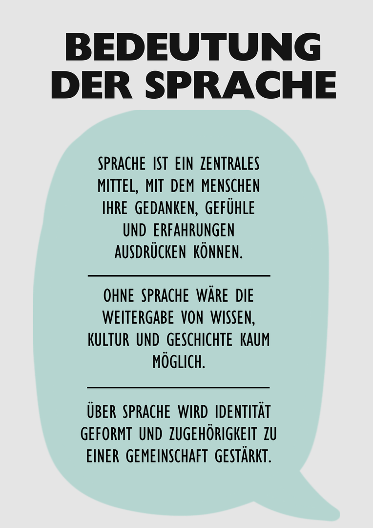 Die Antworten zeigen eindrucksvoll, wie unterschiedlich, aber auch wie verbindend Sprache erlebt wird: Für manche ist sie Heimat und Geborgenheit, für andere Brücke zwischen Kulturen, Zugang zu Wissen oder Schlüssel zu Freundschaften. Sprache trägt Identität, weckt Erinnerungen und schafft neue Perspektiven.
