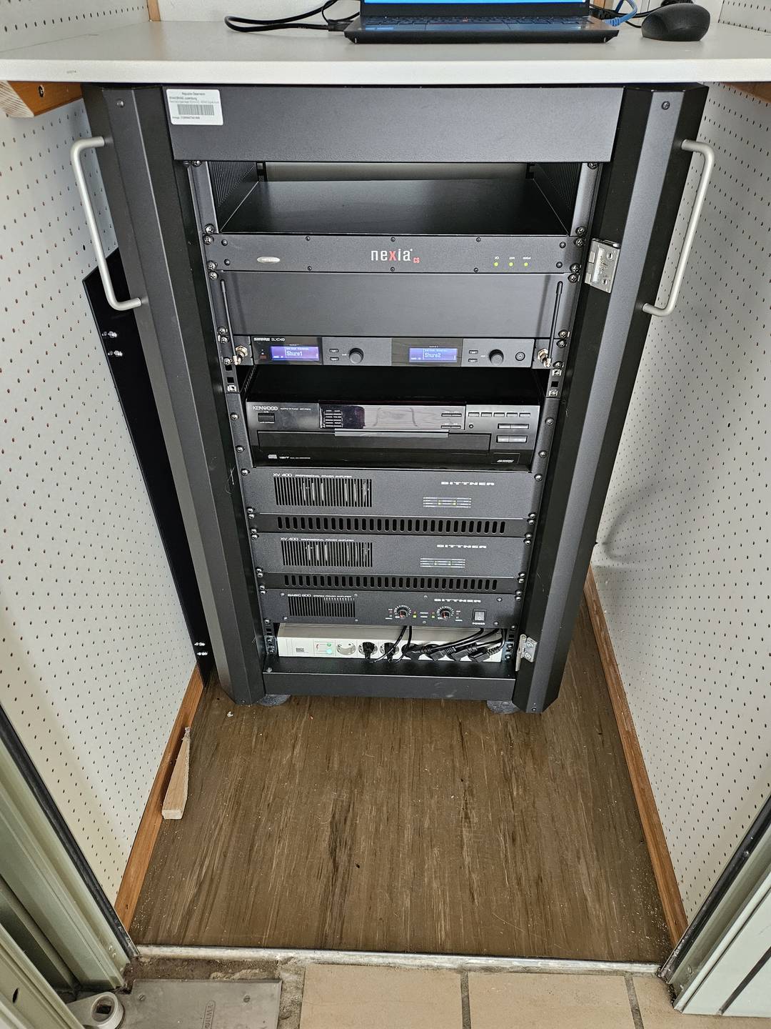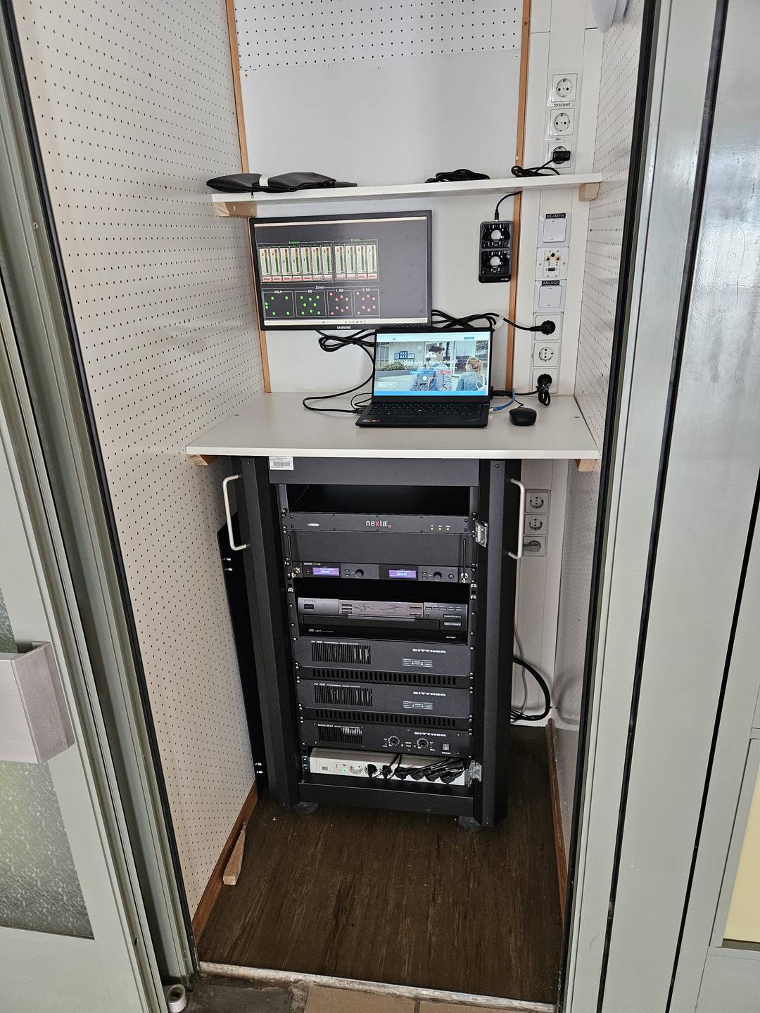 Die Kabine bietet ausreichend Platz und sorgt für verlässlichen Schutz vor Staub, Beschädigungen und unbeabsichtigter Bedienung. Gleichzeitig bleibt die Anlage zentral zugänglich und kann weiterhin flexibel für Veranstaltungen, Präsentationen, Pausenmusik oder Schulprojekte genutzt werden.